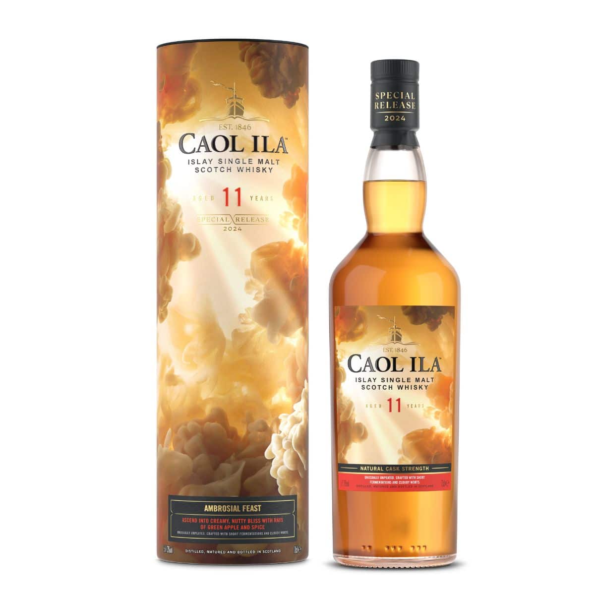 Ambrosial Feast de Caol Ila revela el lado más afrutado y suave de esta destilería de Islay. Madurado en barricas de recarga y ex-vino, ofrece una mezcla cremosa de manzana verde, nuez y especias, alejándose de su clásico perfil ahumado y aspirando a servirse en la mesa de los dioses