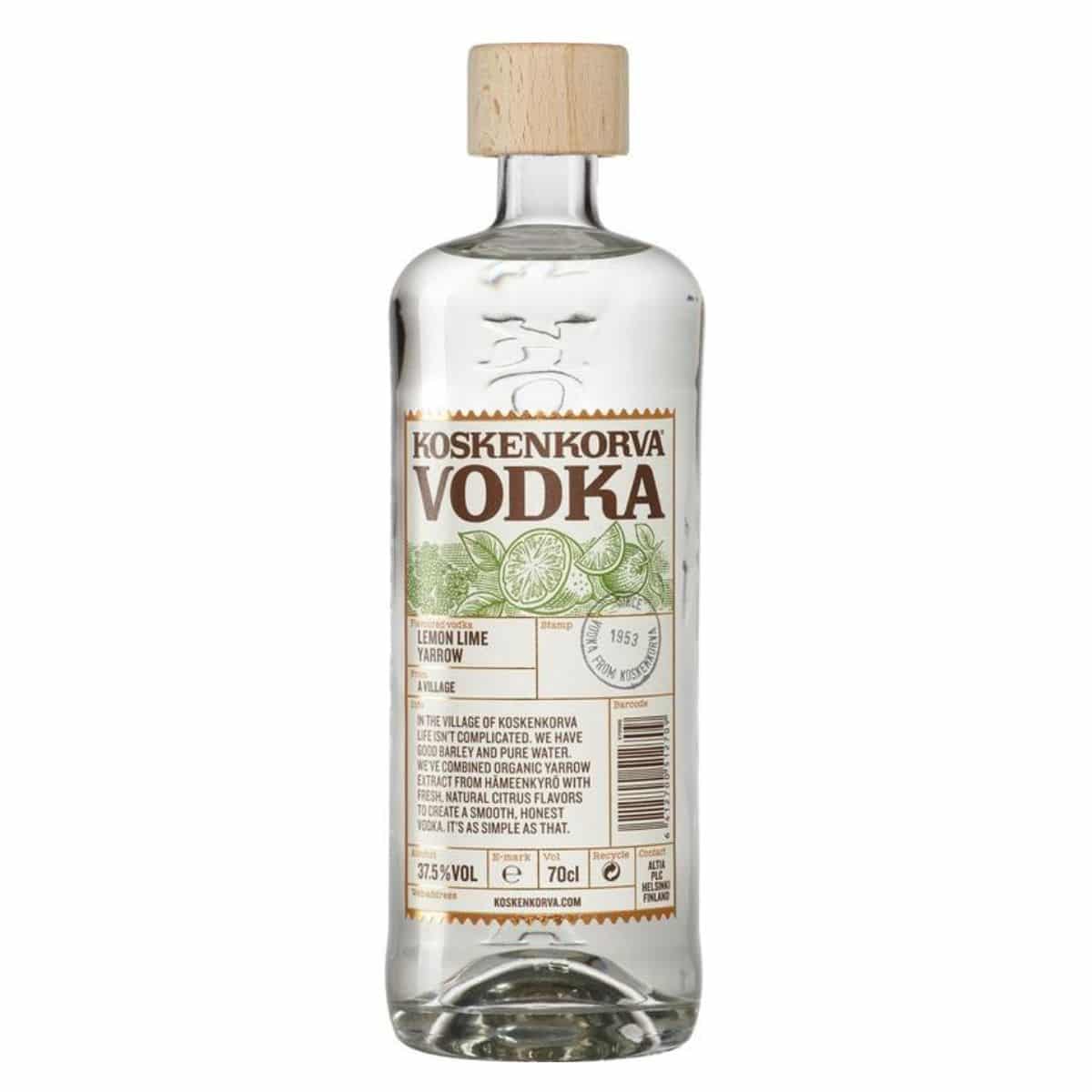 Koskenkorva lima y limón combina sabores naturales de limón y lima con extracto de milenrama real. La milenrama es una planta con flores que le da a este vodka notas herbales agradables y ligeras que aportan un nuevo giro al sabor cítrico fresco